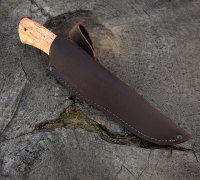 Нож Сибиряк из дамасской стали, рукоять - стабилизированный кап клёна, кожаный чехол идет в комплекте.